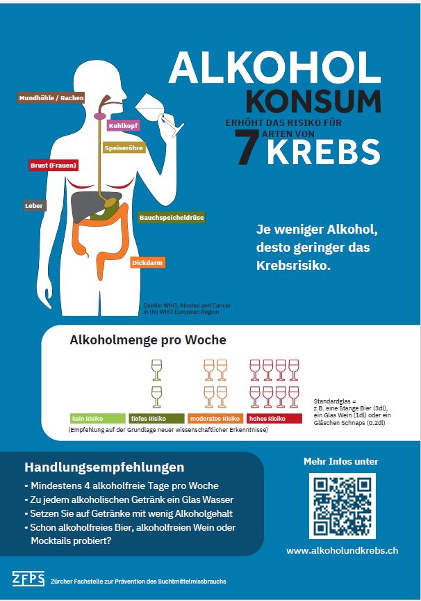 Alkohol und Krebs Sucht im Alter Bodytuning-check ZFPS – Zürcher Fachstelle zur Prävention des Suchtmittelmissbrauchs Die ZFPS ist als thematisch spezialisierte Fachstelle in der Prävention des Suchtmittelmissbrauchs tätig. Dabei legt sie einen Schwerpunkt auf Alkohol, bestimmte Medikamente sowie tabak- und nikotinhaltige Produkte. Sie entwickelt und lanciert zielgruppenspezifische Projekte, führt Weiterbildungen durch, leistet Öffentlichkeitsarbeit und kooperiert eng vernetzt mit verschiedenen Akteuren auf dem Gebiet der Public Health. Die ZFPS gehört zum Verbund der Stellen für Suchtprävention im Kanton Zürich: suchtpraevention-zh.ch. Alkoholmissbrauch Unsere Angebote » Medikamentenmissbrauch Unsere Angebote » Nikotinprävention Unsere Angebote » Dry January 2026 Der “Dry January” ist eine internationale Kampagne, die dazu einlädt, im Januar bewusst auf Alkohol zu verzichten. Ziel ist es, das eigene Trinkverhalten zu reflektieren, die Gesundheit zu fördern und das Wohlbefinden zu steigern – ganz unabhängig davon, wie viel man sonst trinkt. In der Schweiz wird die Initiative seit 2021 durchgeführt und bietet mit der Try Dry-App, einer Website und sozialen Medien praktische Unterstützung sowie Motivation. Viele Teilnehmende berichten von positiven Effekten wie besserem Schlaf und mehr Energie. Mach mit und starte das neue Jahr frisch und voller Energie – es lohnt sich! Aktuelle Ausgabe stark.: Verhaltenssüchte Diese Ausgabe ist den Verhaltenssüchten gewidmet, insbesondere Glücksspiel und Soziale Medien. Ein weiterer Fokusartikel beschäftigt sich mit dem Thema: Kokain – Differenzierte Prävention. Wir wünschen anregende Lektüre und freuen uns, wenn Sie unsere Angebote nutzen. Die Druckausgabe des Magazins kann im Kanton Zürich kostenlos abonniert werden, die Online-Ausgabe ist unbeschränkt abonnierbar. » Hier geht es zum Heft «Präventiv stark!» – Medikamentenmissbrauch im Fokus Interview mit Thea Dolci, Zürcher Fachstelle zur Prävention des Suchtmittelmissbrauchs (ZFPS) Im Rahmen des Präventionstages «Präventiv stark!» der Schulthess Klinik Zürich spricht Thea Dolci über ein oft unterschätztes Thema: den Missbrauch von Medikamenten. In der Tonaufnahme erklärt sie, was unter Medikamentenmissbrauch zu verstehen ist, welche Wirkstoffe besonders häufig betroffen sind und warum Stress, Leistungsdruck oder psychische Belastungen eine entscheidende Rolle spielen. Zudem zeigt sie auf, wie der schleichende Übergang von medizinisch sinnvoller Einnahme zur Abhängigkeit erkannt werden kann und was Betroffene, Angehörige oder Fachpersonen tun können, um vorzubeugen. Das Interview sensibilisiert für einen reflektierten und verantwortungsvollen Umgang mit Medikamenten und betont die Bedeutung von Aufklärung, Früherkennung und offener Kommunikation über psychische Gesundheit und gesellschaftlichen Leistungsdruck. » Jetzt reinhören Copyrights © Schulthess Klinik, Zürich Snus im Trend – besonders bei Jugendlichen Am Dienstag, 14. Oktober 2025 zeigte Kassensturz SRF – Schweizer Radio und Fernsehen einen Beitrag über Snus.Ursprünglich wurde das Produkt entwickelt, um Rauchende bei der Entwöhnung vom Tabak zu unterstützen. Heute ist es jedoch besonders bei Jugendlichen beliebt – ein alarmierender Trend. Warum das so ist, erklärt Präventionsexpertin Dominique Lorandt im Beitrag » Hier geht es zum Beitrag Sind die neuen E-Nikotinprodukte Fluch oder Segen? Immer mehr Jugendliche vapen, neue E-Nikotinprodukte sind für Rauchende nach heutigem Wissenstand weniger schädlich als herkömmliche Zigaretten. Sind die neuen Produkte also Fluch oder Segen? Dieser Frage gehen die Suchtpräventionsexpertin Dominique Lorandt und der Hausarzt und Forscher Reto Auer nach. Lesen Sie den Beitrag auf der Website der Stellen für Suchtprävention im Kanton Zürich und erfahren Sie mehr über Risiken und Chancen von E-Nikotinprodukten und was Sie zur Prävention beitragen können. » Hier geht es zum Interview laut & leise heisst nun stark. Wir haben den Auftritt unseres Magazins aktualisiert und ihm einen neuen Namen gegeben: Das «laut & leise» heisst nun «stark.» Weiterhin widmen wir jede Ausgabe einem Schwerpunktthema, beleuchten Hintergründe und stellen Angebote der Prävention vor. Die erste Ausgabe von stark. ist den Nikotinprodukten gewidmet. Insbesondere das Vapen hat zugenommen und wirft viele Fragen auf. Wir wünschen anregende Lektüre und freuen uns, wenn Sie unsere Angebote nutzen. Die Druckausgabe des Magazins kann im Kanton Zürich kostenlos abonniert werden, die Online-Ausgabe ist unbeschränkt abonnierbar. » Hier geht es zum Heft Der Alkoholkonsum erhöht das Risiko für 7 Arten von Krebs Die meisten Menschen wissen, dass Alkohol der Gesundheit schadet – aber nur wenige sind sich bewusst, dass er auch das Krebsrisiko erhöht. Gemäss der WHO steigt das Krebsrisiko mit der Menge des konsumierten Alkohols. Eine absolut risikofreie Alkoholmenge gibt es jedoch nicht. Es ist deshalb wichtig, sich dieser Gesundheitsgefahren bewusst zu sein und den Alkoholkonsum zu mässigen. Mehr Infos unter www.alkoholundkrebs.ch Wollen Sie uns bei der Verbreitung dieser wichtigen Gesundheitsinformation helfen? Wir würden uns freuen, wenn Sie den Flyer auslegen und/oder das Plakat für Innenräume (42 x 59.4cm) aufhängen könnten. Beide Materialien sind kostenlos bestellbar. Der überarbeitete NicotineFreeCoach ist live! Gute Neuigkeiten! Unser NicotineFreeCoach wurde überarbeitet und erweitert – und ist jetzt live! Das kostenlose WhatsApp-Programm unterstützt dich dabei, deinen Konsum von Nikotin zu reduzieren oder ganz damit aufzuhören. Neu deckt der Coach nicht nur herkömmliche Zigaretten ab, sondern unterstützt dich auch bei Vapes, E-Zigaretten und Snus. Wie funktioniert’s?Du erhältst regelmässig motivierende Nachrichten, praktische Tipps und wissenschaftlich fundierte Infos – direkt auf WhatsApp. Ganz unkompliziert, anonym und ko